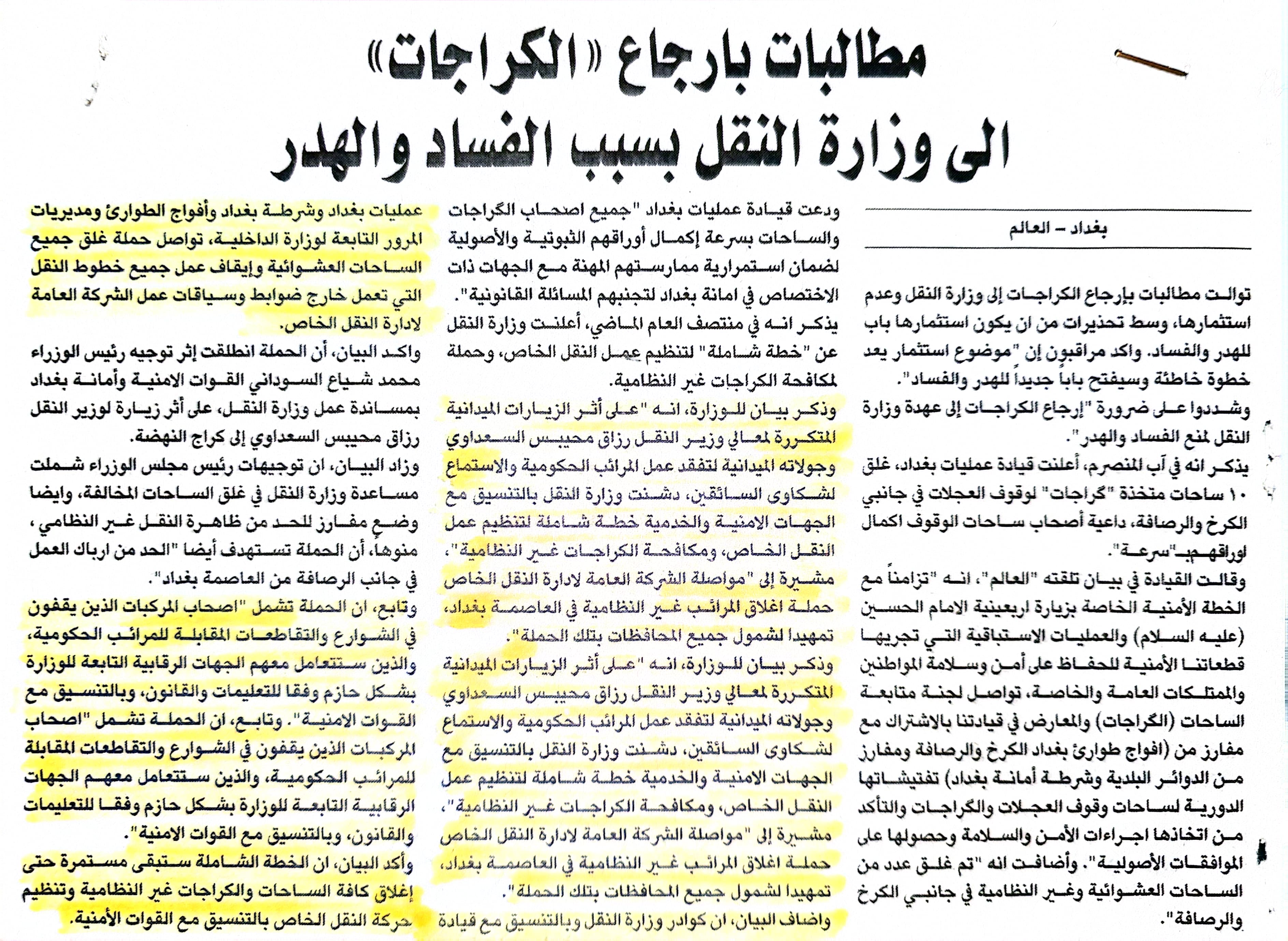 النقل الخاص تعلن انطلاق اسبوع النقل المنظم في بغداد وجميع المحافظات